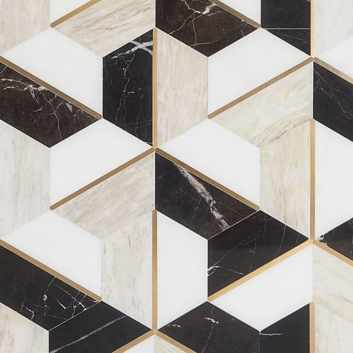 A combination of high-end marbles serves as the base for this series of geometric mosaic tiles, as brass accents and four dazzling colorways elevat...