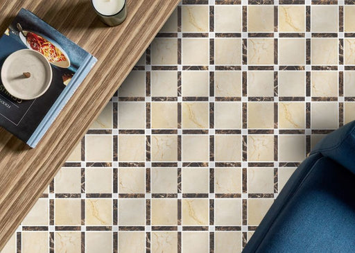 This elegant mosaic blends timeless Spanish marble with rich accents for a refined, classic look. The soft beige tones of Crema Marfil serve as the...