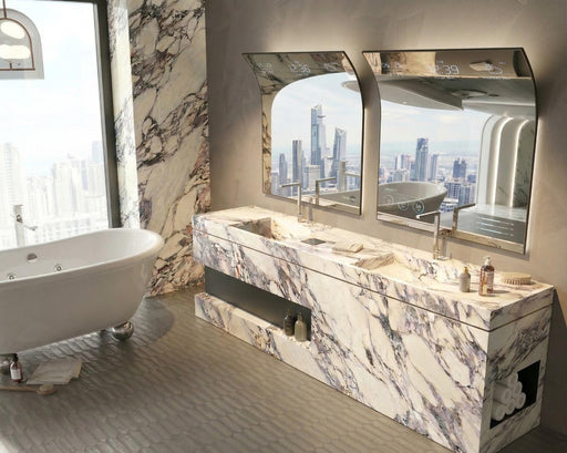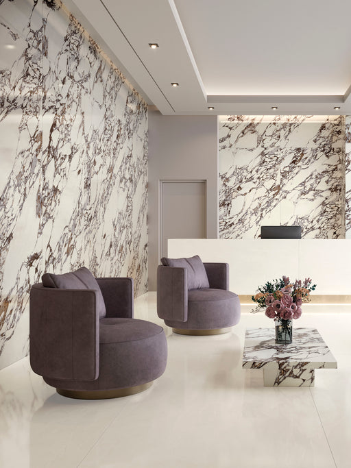 Granviola recreates the dramatic intensity of purple marble, renowned for its unmistakable personality. Its surface combines a luminous base crosse...