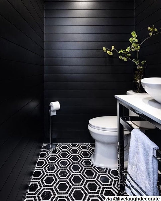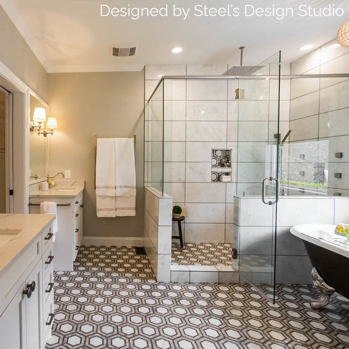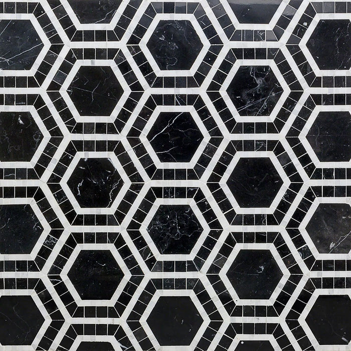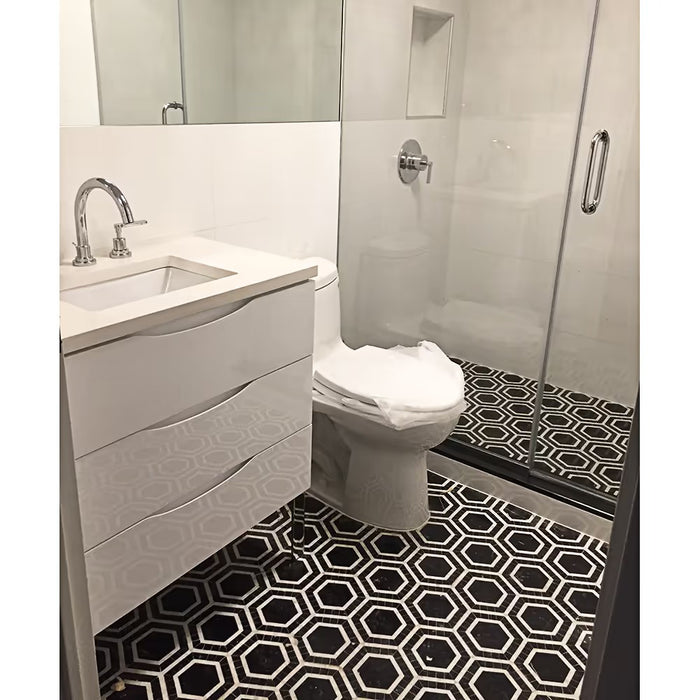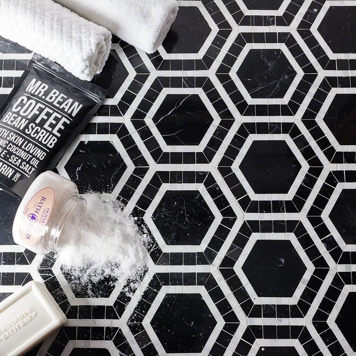 The Metrology Collection is a bold re-imagining of a classic look that takes it's inspiration from timeless patterns of yesteryear and reinvigorates them with a modern twist. The tile is a handmade micro-marble Hexagon mosaic. Available in multiple options.